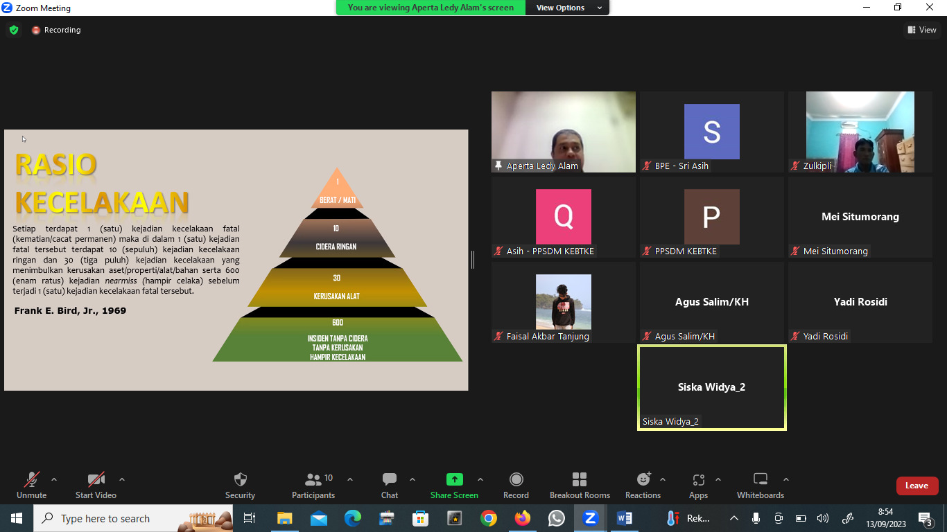 Hadir sebagai pengajar yaitu Aperta Ledy Alam, S.T., M.T., Rohenda, S.T., M.T. Widyaiswara dari PPSDM KEBTKE. Aperta menyampaikan salah satu materi terkait JSA dan penilaian resiko, Analisis Keselamatan kerja (JSA) adalah metode yang dapat digunakan untuk mengidentifikasi, menganalisis dan merekam 1) langkah-langkah dalam melakukan pekerjaan tertentu, 2) Potensi bahaya yang mungkin timbul dalam setiap langkah, 3) Melakukan rekomendasi tindakan/prosedur yang dapat menghilangkan atau mengurangi potensi bahaya-bahaya tersebut.