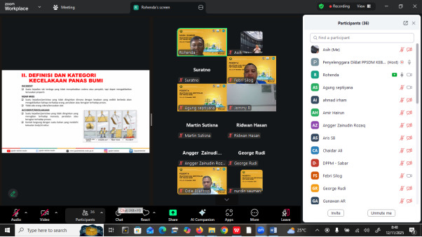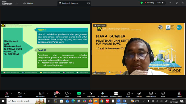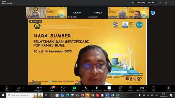 Jakarta, 12 November 2025 - Dalam rangka meningkatkan kompetensi sumber daya manusia di sektor panas bumi, Pusat Pengembangan Sumber Daya Manusia Ketenagalistrikan, Energi Baru, Terbarukan, dan Konservasi Energi (PPSDM KEBTKE) menyelenggarakan Pelatihan Teknis dan Sertifikasi Pengawas Operasional Pertama (POP) Panas Bumi. Kegiatan ini dilaksanakan secara daring melalui platform Zoom, dengan pelatihan intensif berlangsung pada tanggal 10 hingga 12 November 2025, dilanjutkan dengan proses sertifikasi pada 13 dan 14 November 2025. Sebanyak tiga puluh dua (32) orang peserta dari berbagai industri panas bumi di seluruh Indonesia turut serta dalam program ini.