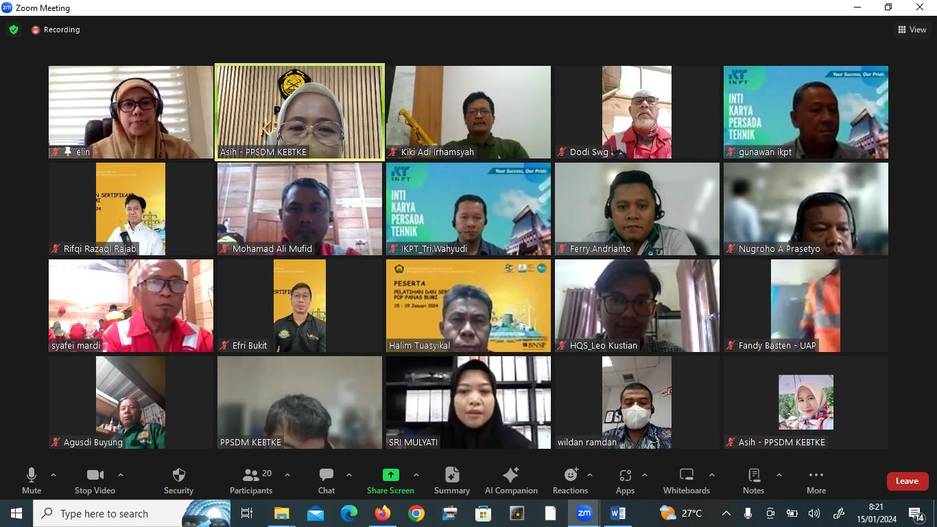 Selama 3 hari ke depan para peserta akan mendapatkan materi terkait Peraturan Perundang-undangan Terkait Panas Bumi dan Tugas dan Tanggung Jawab Pengawas Operasional Terhadap K3LL Panas, Penyusunan Rencana Kerja Kesehatan dan Keselamatan Kerja (K3) dan Penerapannya, Penyusunan Rencana Kerja Lindungan Lingkungan (LL) dan Penerapannya, Teknik Komunikasi Timbal Balik, Inspeksi K3LL Panas Bumi, JSA dan Penilaian Risiko Kegiatan panas Bumi, Investigasi Kecelakaan Panas Bumi, Pelaksanaan SMK3 Panas Bumi, hadir sebagai pengajar yaitu Aperta Ledy Alam, S.T., M.T.,. Kami harap kepada para peserta untuk memanfaatkan waktunya dengan sebaik mungkin walaupun secara online, ungkap Elin.
