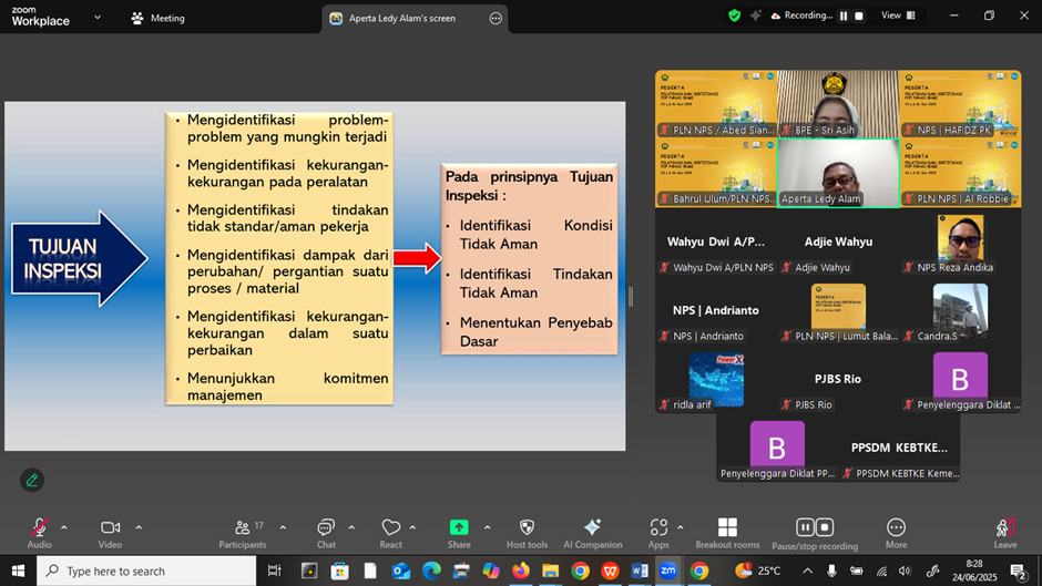 Jakarta, 24 Juni 2025 — Dalam rangka mendukung peningkatan kompetensi sumber daya manusia di sektor panas bumi, Pusat Pengembangan Sumber Daya Manusia Ketenagalistrikan, Energi Baru Terbarukan dan Konservasi Energi (PPSDM KEBTKE) Kementerian ESDM menyelenggarakan Pelatihan Teknis dan Uji Kompetensi Pengawas Operasional Pertama (POP) Panas Bumi secara daring melalui Zoom Meeting. Pelatihan berlangsung selama tiga hari dari tanggal 23 hingga 25 Juni 2025, dan diakhiri dengan uji kompetensi pada 26 Juni 2025.