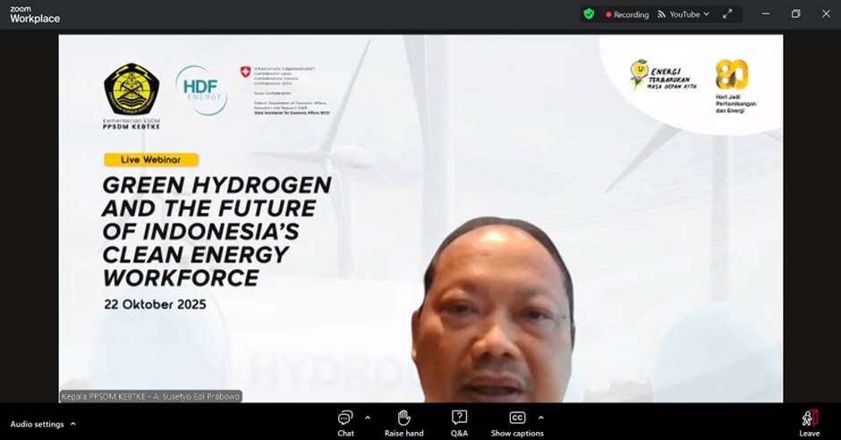Di tengah kencangnya arus transisi energi global, Indonesia kian memposisikan Hidrogen Hijau sebagai salah satu pilar pilar penting masa depan energi bersih di negeri ini. Pusat Pengembangan Sumber Daya Manusia Ketenagalistrikan, Energi Baru, Terbarukan, dan Konservasi Energi (PPSDM KEBTKE) bekerja sama dengan Renewable Energy Skill Development (RESD) menyelenggarakan webinar bertajuk “Green Hydrogen and the Future of Indonesia’s Clean Energy Workforce” pada Rabu, 22 Oktober 2025.