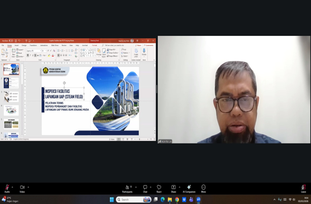 Pusat Pengembangan Sumber Daya Manusia Ketenagalistrikan, Energi Baru, Terbarukan, dan Konservasi Energi (PPSDM KEBTKE) kembali memperkuat kompetensi aparatur sipil negara melalui penyelenggaraan Pelatihan Teknis Inspeksi Pembangkit dan Fasilitas Lapangan Uap Panas Bumi Jenjang Muda. Kegiatan yang berlangsung selama empat hari, mulai tanggal 3 hingga 6 Maret 2026 ini, menjadi salah satu langkah strategis untuk memastikan kesiapan tenaga teknis dalam mengawasi infrastruktur energi hijau di Indonesia. Sebanyak 16 orang ASN dari Direktorat Panas Bumi, Direktorat Jenderal EBTKE, berpartisipasi penuh dalam pelatihan yang dilaksanakan secara daring ini.